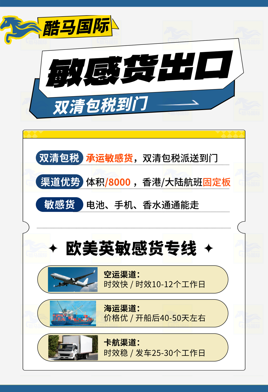 酷马国际凭借专业的服务体系与多元的渠道布局,为您的敏感货出口提供可靠、高效的解决方案,助力跨境贸易顺畅开展。